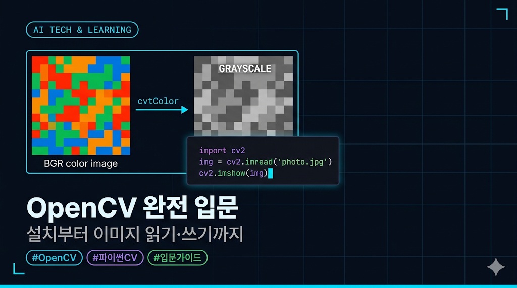 카테고리: AI 기술 공부 노트태그: OpenCV, 파이썬, 컴퓨터비전, cv2, 이미지처리, 머신러닝전처리Rank Math 핵심 키워드: 파이썬 OpenCV 설치, cv2 이미지 읽기, OpenCV 튜토리얼썸네일 프롬프트 (Nanobana): Dark futuristic cyberpunk background (#070b14). A glowing cyan terminal window showing Python code with import cv2. On the right, a split-panel showing a color photo transforming into a grayscale version. Electric … 더 읽기